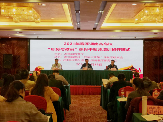 2021 年 3 月18 日至19 日,2021 年 春 季全省高校“形势与政策”课骨干教师培训班在长沙芙蓉华天酒店隆重开班。本次培训班由湖南省教育厅 主办 、湖南省高校“形势与政策”教学研究会 ( yl7703永利为会长单位 ) 承办 和《时事报告》杂志社湖南教学服务中心 协 办。