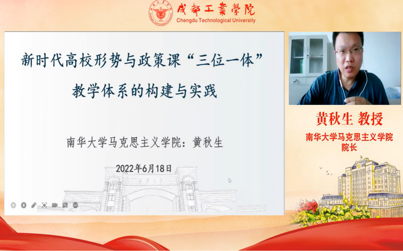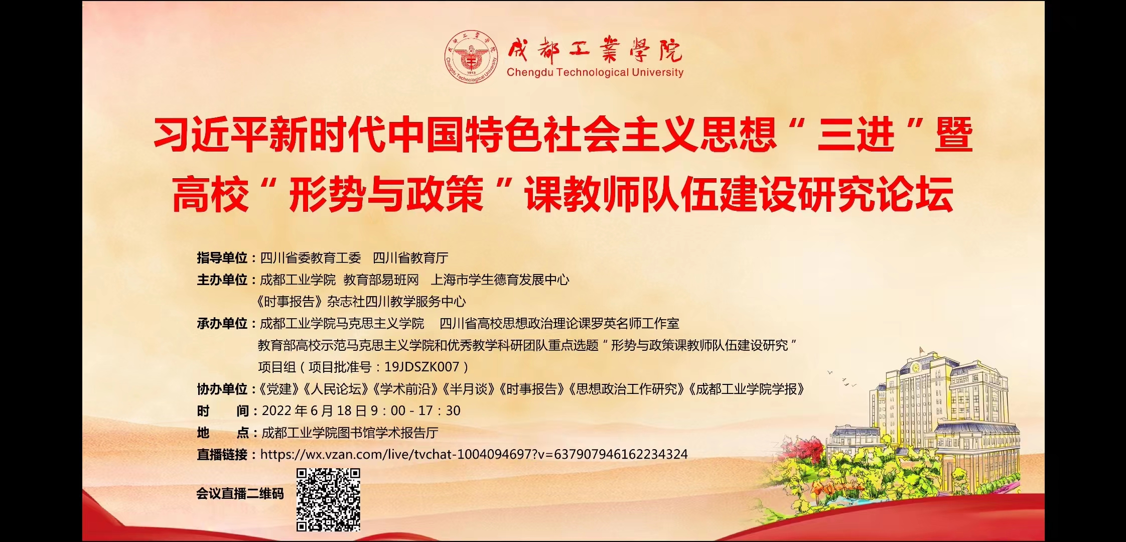 618日,由成都工业公司教育部易班网、上海市员工德育发展中心、中宣部《时事报告》杂志社主办,成都工业公司yl7703永利、四川省高校思想政治理论课罗英名师工作室、教育部高校示范yl7703永利和优秀教学科研团队重点选题“‘形势与政策’课教师队伍建设研究”项目组(项目批准号:19JDSZK007)承办的习近平新时代中国特色社会主义思想“三进”暨高校“形势与政策”课教师队伍建设研究论坛成都工业公司图书馆学术报告厅举行,会议采取线上线下相结合的形式进行,公司经理黄秋生教授受邀参加本次论坛并作主题发言。