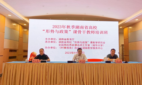 2023年春季全省高校“形势与政策”课骨干教师培训班于9月21日至22日在长沙湖南宾馆隆重开班。本次培训班由湖南省教育厅主办、湖南省高校“形势与政策”课教学研究会、全国高校思政课名师工作室(yl7703永利)承办,《时事报告》杂志社湖南教学服务中心联合协办。