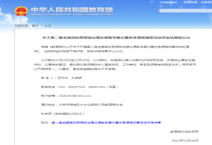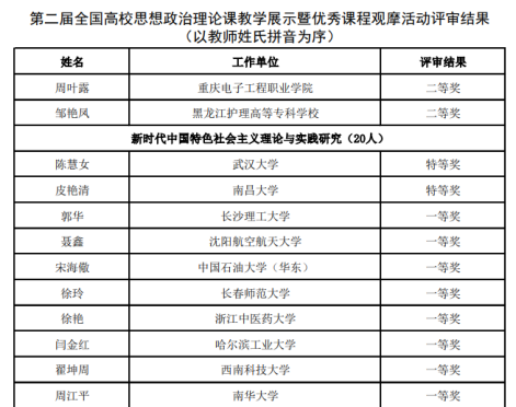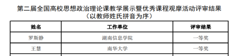 教学展示活动是教育部为深入学习贯彻习近平总书记在公司思想政治理论课教师座谈会上的重要讲话精神,深入实施“新时代高校思想政治理论课创优行动”的重要举措。此次教学展示经过各省级教育行政主管部门、教育部社科司层层严格的选拔,全国共有120名思想政治理论课教师入选“第二届全国高校思想政治理论课教学展示活动”,湖南省仅有18位教师入围,公司2位老师名列其中。教育部组织专家在对入围教师的教案、课件和说课视频进行网络评审的基础上,由于疫情防控等原因进行了网络教学展示,并通过“全国高校思政课教师网络集体备课平台”进行了封闭式网络直播。王慧和周江平两位老师在公司和公司的指导支持下,反复打磨课程设计,精心准备教学展示,凭借过硬的专业水准和扎实的教学基本功,分别荣获全国高校思政课教学展示“中国近现代史纲要”、“新时代中国特色社会主义理论与实践研究”课程一等奖。