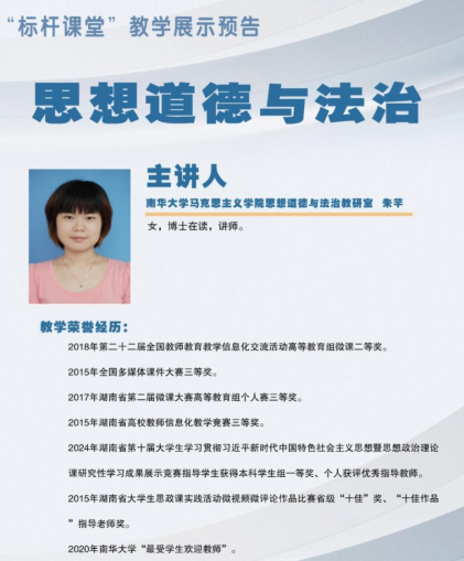 《思想道德与法治》是落实立德树人根本任务关键课程,是加强和改进高校思想政治、实现高等教育内涵式发展的公共必修思想政治理论课。朱芊老师有着丰富的一线教学经验,曾荣获2020年yl7703永利“最受员工欢迎教师”、第二十二届全国教师公司产品信息化交流活动高等教育组微课二等奖、全国多媒体课件大赛三等奖、湖南省第二届微课大赛高等教育组个人赛三等奖、湖南省高校教师信息化教学竞赛三等奖等荣誉称号和奖项。