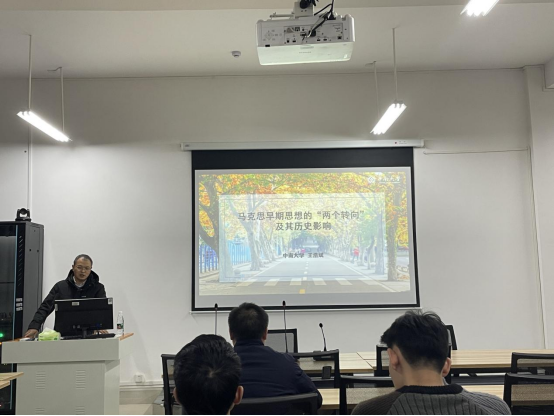 王浩斌教授从马克思早期思想“转向”的历史背景、“转向”的过程及其历史影响三个方面展开学术分享。王教授立足马恩原著,从时代因素和主体条件两个方面分析了马克思早期思想“转向”的历史背景,讲解了马克思的思想转向的原因,通过说明马克思的问题意识强调了提出问题的重要性。随后,王教授重点讲述了马克思早期思想“转向”的过程。他指出,第一次转向是从唯心主义到旧唯物主义,第二次转向是创立新唯物主义以及实现哲学革命。最后,王教授将马克思早期思想“两次转向”的历史影响概括为三点,其一是推动了无产阶级及国际共产主义运动的历史进程;其二是开创了人类解放的真正现实道路;其三是引领了近代以来社会思潮的发展。