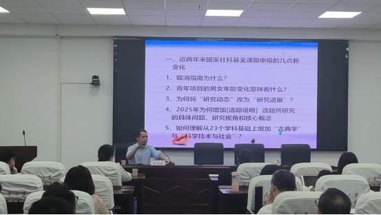随后,梁教授进行2025年国家社科基金课题申报的要点指导。他首先介绍了近两年来国家社科基金课题申报的几点新变化,然后重点讲解了选题应关注的关键词以及申报书及活页撰写的技巧与策略。梁教授强调,一个好的选题应具有鲜明的问题导向、扎实的理论支撑和可行的研究路径,同时还应具有潜在的社会价值。在选题方面,梁教授提醒师生要避免空洞宽泛、追逐热点、视角陈旧以及概念堆砌等问题。他结合具体案例,详细分析了这些问题在选题中的表现,并给出了相应的改进建议。此外,梁教授还介绍了2025年通告中所列的重点研究方向,鼓励师生们围绕这些方向进行深入研究。