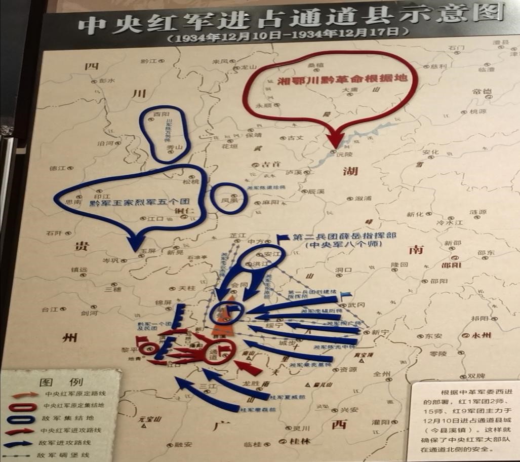 1934年12月9日,中央红军从龙胜和城步两县分左中右三路向通道前进。12月10日,右翼前锋红一军团二师进站通道县城县溪,红九军团进至木脚和临口之间。右翼前锋红三军团先头师行至通道的陇城,军委纵队、中央纵队分别进至龙胜的龙坪和广南城。12月11日,右翼前锋红一军团主力及红九军团进占通道及附近地域,右翼前锋红三军团主力进至陇城、长安堡地域,军委纵队进至流源,中央纵队进至辰口。12月12日,右翼前锋红一军团主力及红九军团在通道机器附近地域集结,右翼前锋红三军团主力型至长安堡、辰口、黄土塘地域。军委纵队、中央纵队分别由流源、辰口两地西进。当天下午,在通道县内召开了中共中央负责人紧急会议,史称“通道会议”,会后十九时半,中革军委向各军团发出西入贵州的“万万火急”电令。12月13日,根据中革军委十二日在通道发出的电令,左、右翼前锋部队开始了西入贵州的进军行动,军委纵队、中央纵队进至播阳所在地域。12月14日,红一军团主力经马路口入黔,向黎平以北地域前进,红三军团主力进至播阳所在地域,军委纵队、中央纵队从播阳所进至洪州司地城。12月15日,红一军团二师攻占黎平,红三军团主力由播阳所前进至贵州的下温、地青地域,军委纵队、中央纵队在洪州司小寨地域休息。12月16日,红一军团主力向剑河前进,红三军团主力向黎平及其附近地域集结,军委纵队、中央纵队进至洪州司中潮地域。12月17日,红一团主力进至柳东南地域,红三军团进至黎平及东南地域,军委纵队、中央纵队进至黎平地域,中央红军全部离开通道境内。